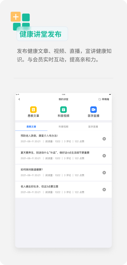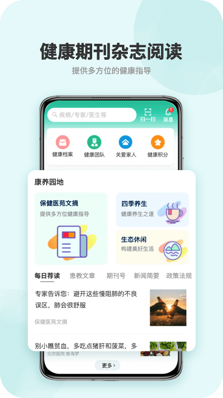 平台上线《保健医苑》杂志,通过对健康知识的学习,累计素养积分,从而从内在改善生活习惯,为用户获取健康知识、交流健康信息、了解健康产品、问诊提供了全方位的健康服务。